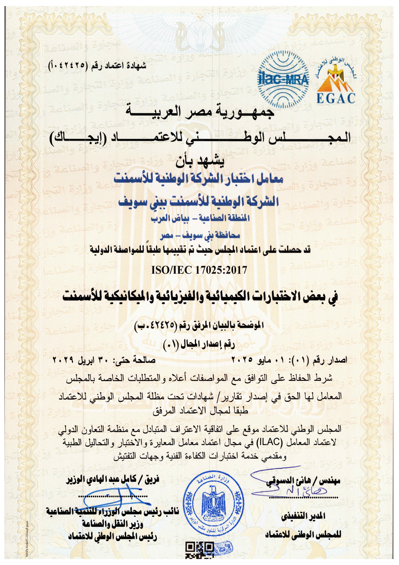 - تلتزم إدارة معامل الشركة الوطنية للأسمنت ببني سويف بتوفير أعلى جودة للاختبارات التي تجرى داخلها وتقع ضمن مجال الاعتماد ، والمعمل ملتزم بتلبية متطلبات ISO/ IEC 17025: 2017 وكذلك متطلبات جهة الاعتماد جنبا إلى جنب مع احتياجات العملاء. ولتحقيق ذلك ، يعمل المعمل على: